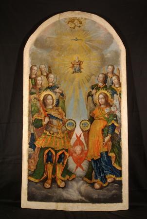 This iconography was formed in the Byzantine Empire in the 9th century on the occasion of the victory over the iconoclasts and the resumption of icon worship. The Synaxis of Archangels is a gathering of bodiless powers of nine angelic hosts. The main dogmatic meaning of the icon is the unification of the Forces of Good around the idea of Deity. The archangels Michael with a fiery sword in his hand and Gabriel with a lily are depicted in the centre of the icon on two sides. In addition to the mentioned attributes, the archangels hold disks bearing the legends “Who is like God” and “Holy, Holy, Holy”. We can see the host of angels behind the archangels and the Savior Emmanuel in shining light in the center above. The Holy Spirit as a Dove and God the Father are above Him. The icon of the Baroque heyday showed features of the Rococo elegance.