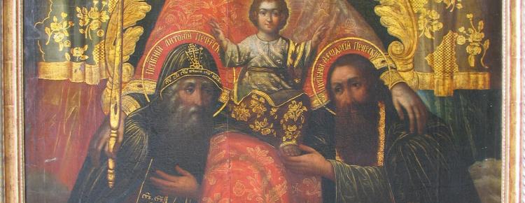 The icon depicts the Virgin enthroned with Sts. Anthony and Theodosius of Pechersk, who fell to her knees. As a sign of special intercession, Our Lady with Christ the Child on her knees laid her hands on the shoulders of the founders of the Pechersk Monastery. The iconography of the work is based on the engraving by Nykodym Zubrytsky from Lavra editions and has been widespread since the beginning of the 18th century. In the composition there is another significative and very touching detail: St. Theodosius touches the foot of Christ the Child. The icon impresses not only with its scale, but also, first of all, with the emotionality of the images: the Mother of God is gentle and very human, and Sts. Anthony and Theodosius of Pechersk are insightful, they seem to appeal to the viewer.