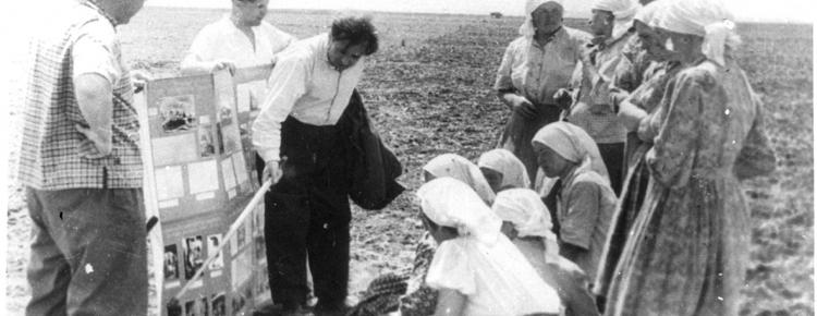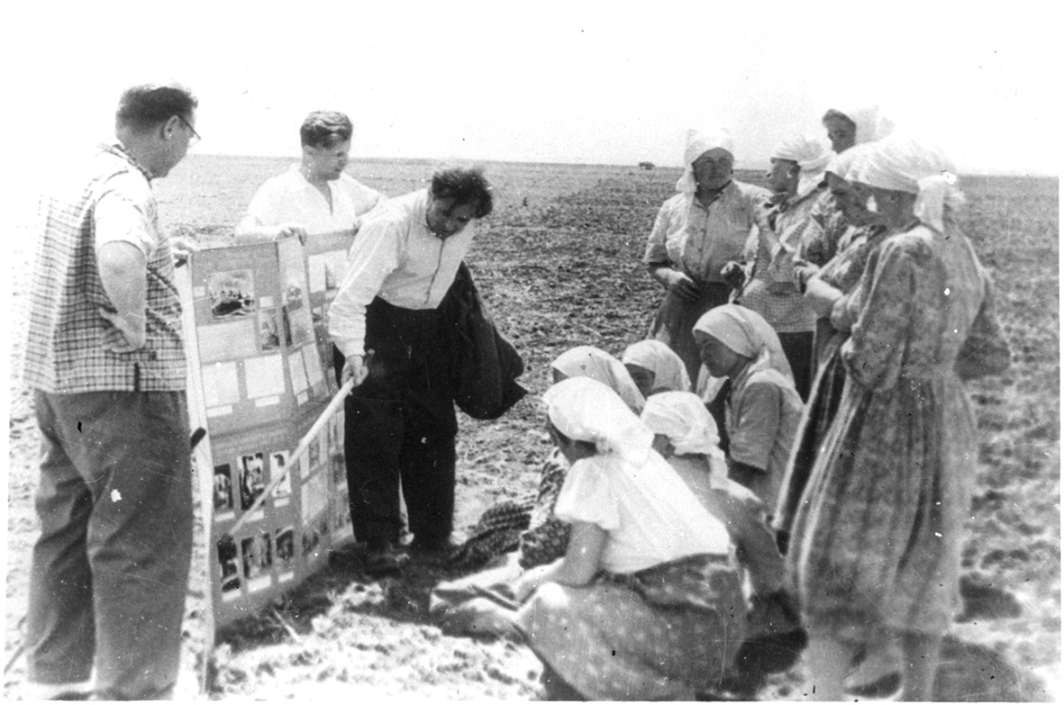 5. Research workers of the Preserve P. Darmansky, P. Stepanov, V. Shydenko (with a pointer) give a lecture to kolkhozniks (collective farmers) in the field. Bila Tserkva district of Kyiv region.