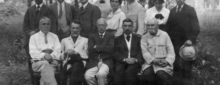 Fig. 1. Danylo Shcherbakivsky. Early 20th century. [NA IA NAS of Ukraine, f.10, file 54, page 19]. Fig. 2. Danylo Shcherbakivsky among colleagues on the territory of the All-Ukrainian Museum Town. 1926 Standing: Antin Onyschuk (1883–1937), Pavlo Popov (1890–1971), Dmytro Revutsky (1881–1941), Petro Rulin (1892–1940/1941), Olena Kurylo (1890–1946?), Danylo Shcherbakivsky (1877–1927), Lydia Shulgina (1897–1938?), Viktor Petrov (1894–1969); sitting: Vyacheslav Kaminsky (1869–1938), Vasyl Lyaskoronsky (1859–1928), Andriy Loboda (1871–1931), Klyment Kvitka (1880–1953), Porfiry Demutsky (1860–1927). [NA IA NAS of Ukraine, f. 9 (Danylo Shcherbakivsky)].