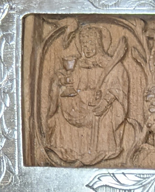 In the bottom of the reverse side of the Cross one can see a brutal scene of the Martyr’s breast being cut off with large and sharp forceps. On the right shoulder there is Barbara’s father who cuts off her head, on the left - the image of sacred traditional iconography, with attributes: a palm branch and a sword in the left hand and a chalice - in the right hand. In the upper Cross end there is the image of St. Juliana the Great Martyr, dressed in royal attire. She adhered to the Christian religion, was tortured in the same way as St. Barbara the Great Myrtar and was executed on the same day as her.