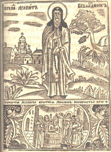 A Kyivan, he took the monastic vows during the life of St. Anthony of Pechersk and, as his follower, began to help the sick. If one of the brothers was ill, Agapit came to his cell and cared for the sick, constantly praying to God for his healing. People began to come to the Pechersk healer but he kept his vows and never went beyond the monastery walls. He gave the sick his own food under the guise of a medicinal potion but healed by prayer. The selfless physician never took anything for treatment, so as not to lose the gift of God for the sake of gold. Patericon tells about the absent healing of Volodymyr Monomakh by Agapit when the prince ruled in Chernihiv.