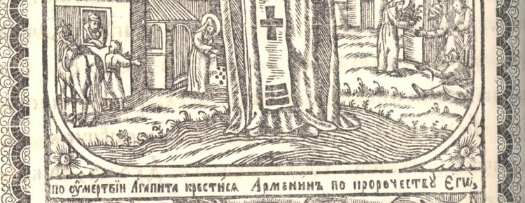 Engraved illustrations of early printed books from the Preserve collection – “Patericon Pechersky” (1661) and the publication “Services to the Reverend Pechersk Fathers” (1763) feature St. Agapit standing in the middle of the monastery courtyard. The scene of the baptism of the Armenian is depicted at the bottom of the figure. The icon near the shrine with the relics of St. Agapit in the Near Caves was painted in the 1840s by Lavra icon painters who worked under the direction of hieromonk Irinarkh. In the paintings of the Church of All Saints, made in 1906 by students of the Lavra Icon Painting School under the direction of Ivan Izhakevych, St. Agapit is represented on the arch of one of the northern windows. An unusual iconographic detail is a plate with carrots in the hands of the Saint. In that way, according to Patericon, the food that the healer gave to the sick as a medicinal potion was presented. Modern icon painters often depict St. Agapit with a bunch of medicinal herbs in his hands.