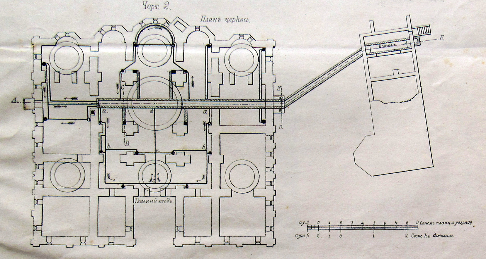 A low-pressure water heating boiler that was 24 feet (7.3 m) in length and 4.5 feet (1.4 m) in diameter, contained 64 cubic meters of water. It was located in the basement of a separate building at a distance of 11 yards (about 23 m) from the Church. Those two points were connected by the underground brick gallery, which was 2.5 arshins (178 cm) high and 1.25 arshins (89 cm) wide. In the Cathedral the gallery branched into several winding air ducts of smaller cross-section. In the middle of each of those smaller galleries there were pipes with hot water. “Special vertical furnaces” or batteries with vertical ribs (that were 1 foot/0.3 m in diameter and 7.5 feet/2.3 m in their height) were installed in the temple. In addition, there also appeared small mines in the building. Through them the warm air, which was coming out of the air duct, c ould get into the Great Church premises. Six months later, Ivan Lilier received a reward of 500 rubles for his work. The system and equipment were tested and showed good performance.
