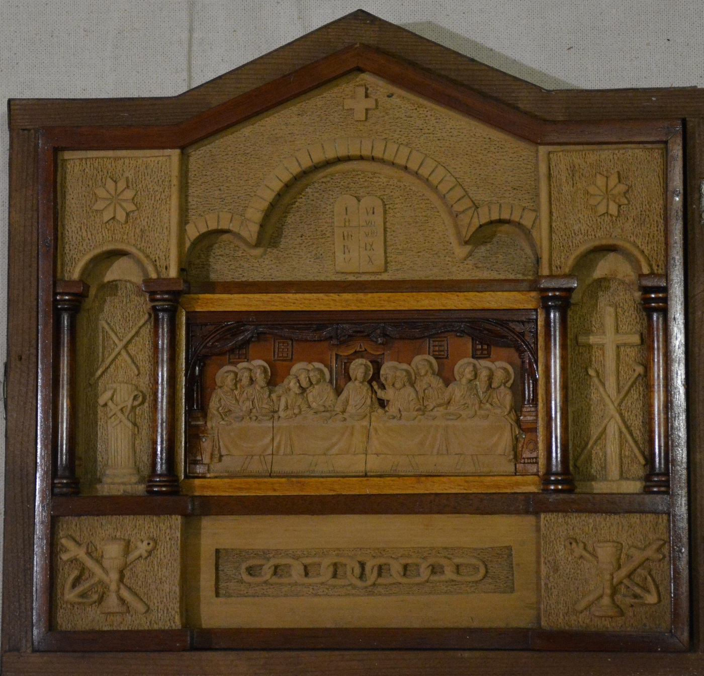 A fresco by Leonardo da Vinci of 1495–1497 from the church of Santa Maria delle Grazie of the Dominican monastery in Milan was the source of the iconography of the Last Supper Icon. In the 19th century, the painting of the genius master was often embodied in carving. The presented artwork features a multi-figure carved composition with an original design - a table with twelve apostles sitting around Jesus Christ in the center is fixed in the recess of a massive wooden ark. The contours of the ark resemble a basilica. Each element of the icon - a table, serveware, a luxurious fabric curtain hanging over the table were carved and fixed separately. The tiny size of the piece of art, 15 cm long, distinguishes it from other well-known similar works.