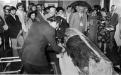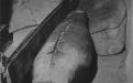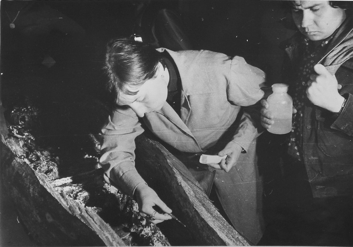 9. Placing the burial logs into their initial places after the research. A leather covered log in locule №44. Nearby - museum attendant N. Pryshchepenko
