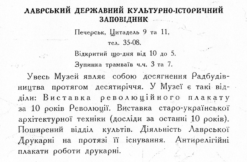 The third request was sent to the Excursion and Lecture Bureau of Kyiv Office of Political Education. The Administration of Lavra’s Preserve insisted on organizing several excursions for tram conductors and police officers “to acquaint them with the tasks of the Museum Town and explain the association of that place with Lavra only if that was necessary”.
