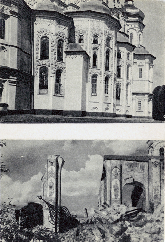 14. Image of the pre-war Dormition Cathedral and its ruins. Photo by G. Logvin