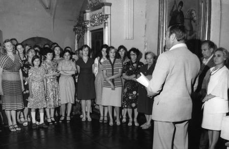 14. Funds inspecting commission From left to right - employees of the Preserve’s funds: chief curator L. Kovaleva (second), G. Lystopad (fourth), K. Prasolova (Gereles) (fifth), G. Marchenko (seventh), O. Udovenko (eighth), N Chenakal (eleventh), O. Mishneva (fourteenth). October, 1986.