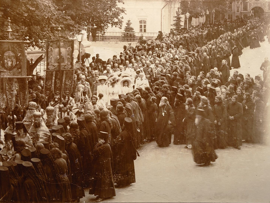 On April 22, 1910, the relics of St. Euphrosyne of Polotsk were solemnly translated from the Far Caves of the Kyiv-Pechersk Lavra to the Savior-Euphrosyne Polotsk Monastery. On this day, the relics of the Saint were carried across the Lavra and after the liturgy were placed on a steamer, which went the same day to Polotsk. The photo captures the moment of the translation of relics from the territory of the Far Caves.