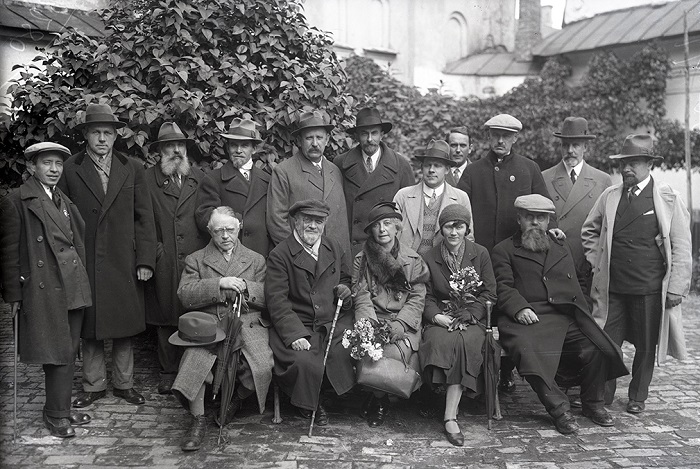 3. A group of foreign visitors to the All-Ukrainian Museum Town is standing against the southern facade of the Gate Church of the Trinity of Kyiv-Pechersk Lavra, and to the right of building №6 (Museum of Ukraine), 1930s. Standing 3rd from the left is Volodymyr De Parma, sitting 2nd from the left is Pavlo Pototsky. [National Kyiv-Pechersk Historical and Cultural Preserve, inv. № KPL-N-1491]