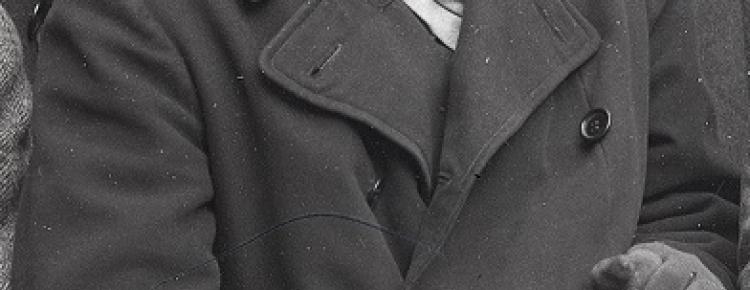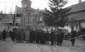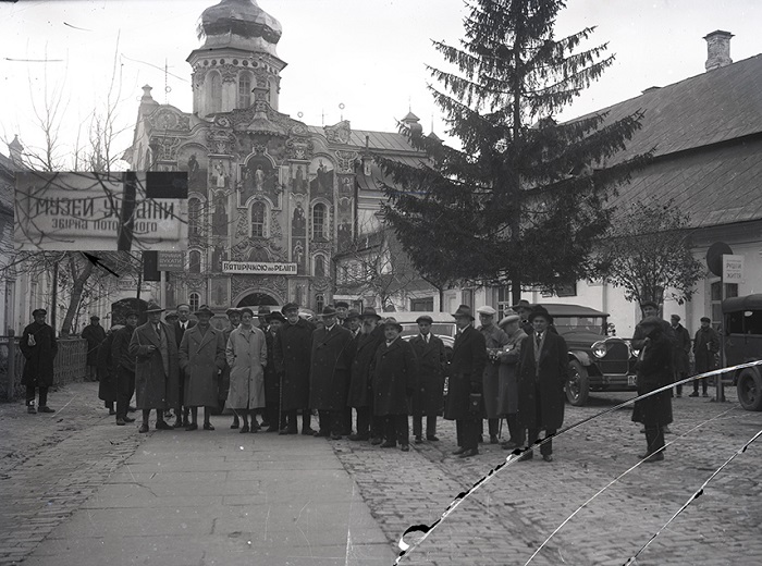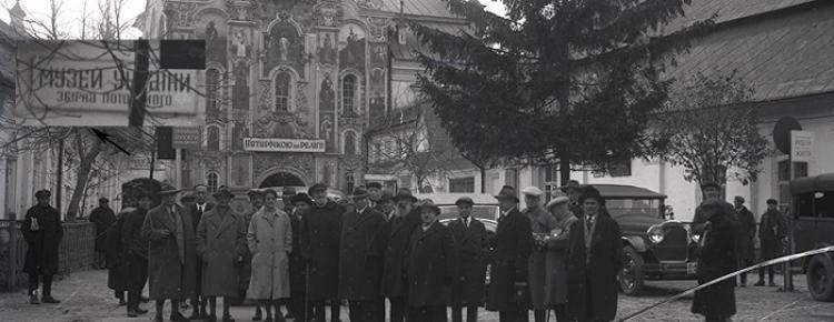4. A foreign delegation to the All-Ukrainian Museum Town, Volodymyr De Parma and Pavlo Pototsky, as staff members of the Kyiv-Pechersk Lavra, are standing against the background of the eastern facade of the Gate Church of the Trinity, 1930s [National Kyiv-Pechersk Historical and Cultural Preserve, inv. № KPL-N-1509]