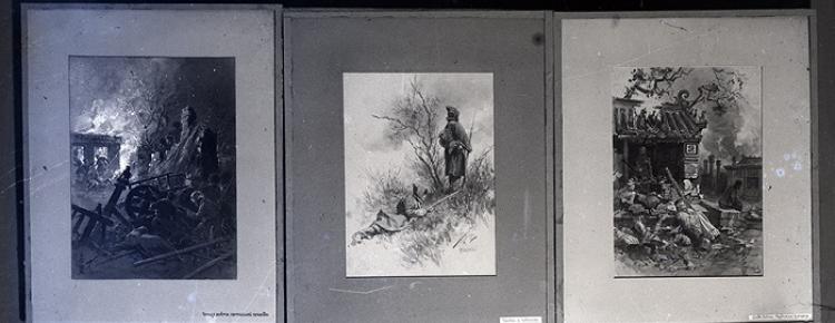 5. Exhibits from Pavlo Pototsky’s Collection. Captions to the works (from left to right) “Night work of the hunting team”, “Watchman and watchman’s assistant”, “Trace of war. Ruined prayer room” [National Kyiv-Pechersk Historical and Cultural Preserve, inv. № KPL-N-1736]
