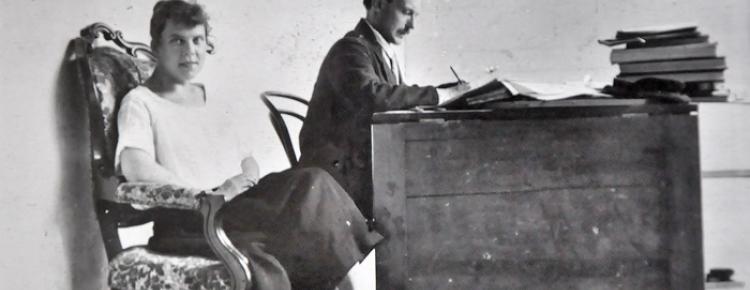 3. Pavlo Popov, head of the Writing and Printing Department of the Lavra Museum of Cults and Life, and his wife Vera during the registration of museum exhibits. 1924 [Institute of Manuscripts of Volodymyr Vernadsky National Library of Ukraine, photo Nr. 285, file Nr. 2964]