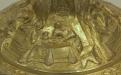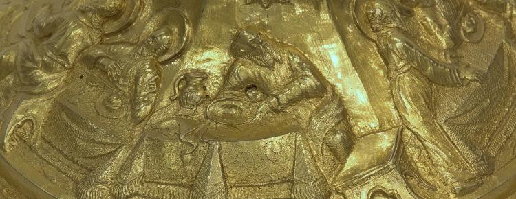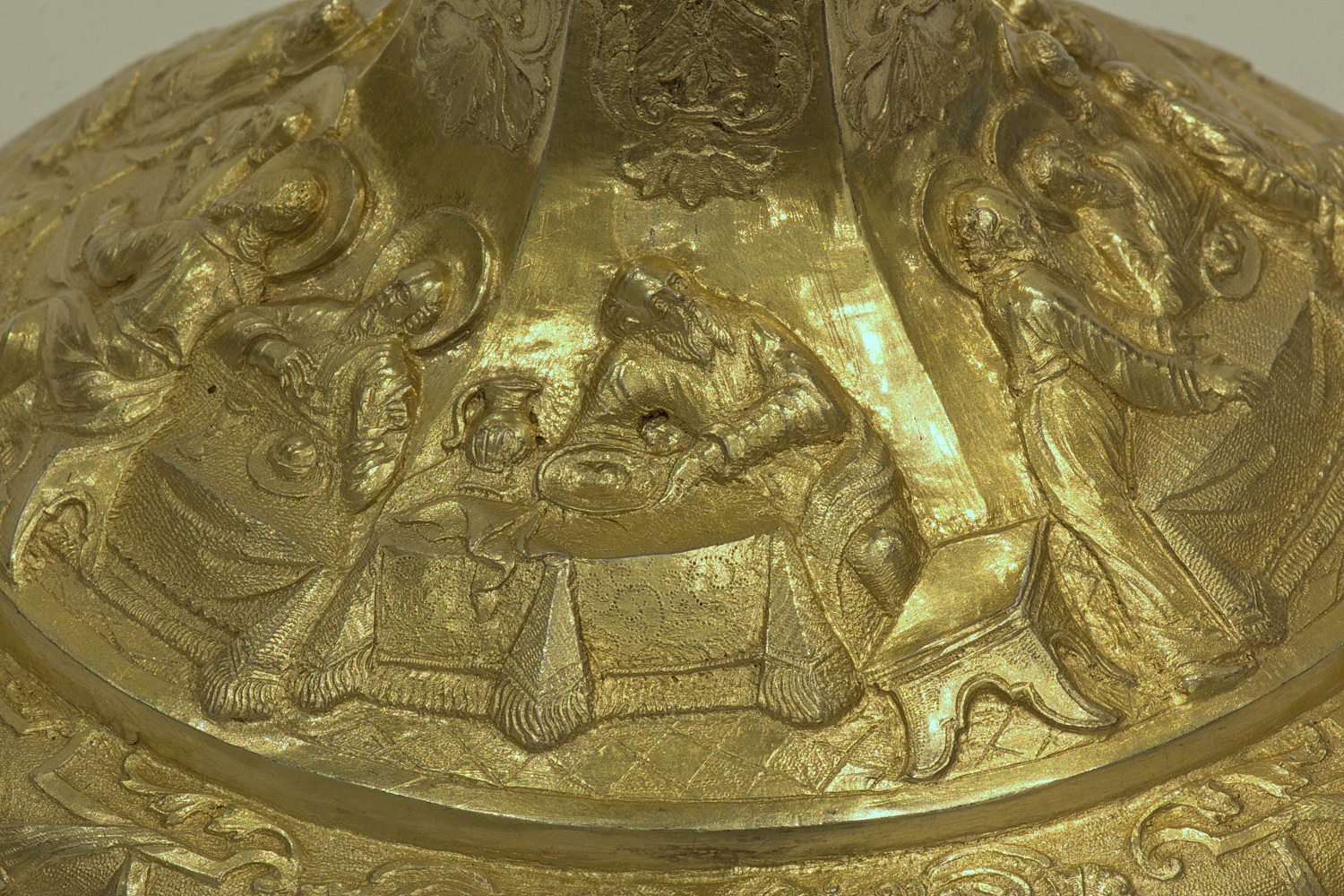 We present to your attention an outstanding object of jewelry art from the Preserve's collection. A silver chalice was donated by the monk Ivestion, Lavra's librarian, to the Trinity Church of St. Nicholas Hospital in 1755. It is evidenced by the inscription on the vessel. The medallions of the chalice feature the embossed compositions of the Crucifixion with side figures, Ascension of Christ, Coronation of the Mother of God and St. Nicholas. The decor of the base of chalice deserves special attention. A multi-figure composition of the Last Supper covers all surfaces of the base. Its iconography is unique and features fourteen characters, while, this scene usually represents Christ and eleven or twelve apostles. The characters are both dynamic and restrained. The figure of Judas is separated from the other participants in the meal. Traditionally there is no halo around his head. The fourteenth character of the composition has no halo as well. He is an elderly man sitting at a separate table with a plate and a large jar. This is probably an image of the owner of the house where the Last Supper takes place. The Gospel text confirms it: “And he said unto them, Behold, when ye are come into the city, there shall a man meet you, bearing water in a pitcher, and ye shall follow him unto the house whither he goeth” (Luke 22:10, 12).