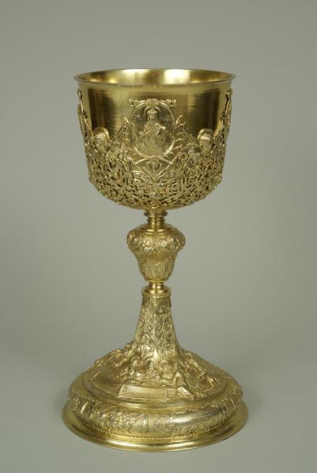 A chalice is a liturgical vessel, carrying the symbolic meaning of the cup of the Last Supper. The symbolics of the chalices' decoration unites the sacrament of Holy Communion, the mystery of the Nativity of Christ from the Virgin Mary, and the cup of the suffering of Christ for the sins of the whole world. This vessel also symbolizes the unity of the Church of Heaven and Earth.