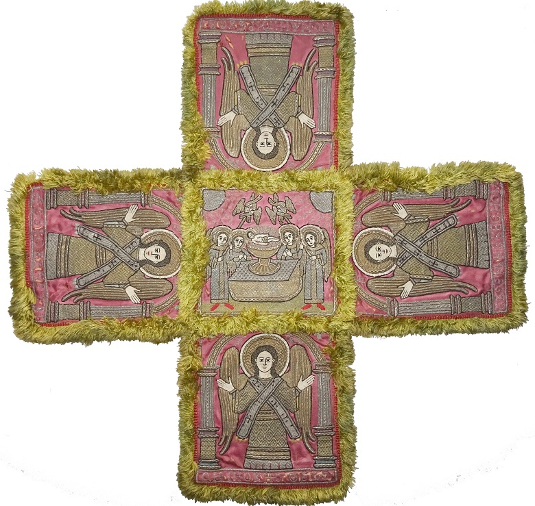 Veils in the form of a Greek cross, intended for covering the chalice during the liturgy, have become widespread in the liturgical practice of the Ukrainian Church since the middle of the 17th century and gradually supplanted the old rectangular shape. The conditional name of figured veils, which has become entrenched in modern museum terminology, is “cross-shaped”. Instead, in the descriptions of church utensils of the 17th-18th centuries they were called “winged” or “complex”. The decoration of the cross-shaped veils provided for the placement of the plot composition in the middle part, which had a square shape. Usually, these were plots on the theme of Christ's atoning sacrifice. In the 17th century, the images of archangels have been usually embroidered on the edges of the cross-shaped veils, and since the 18th century, they were replaced by cherubim images.
