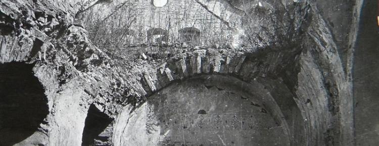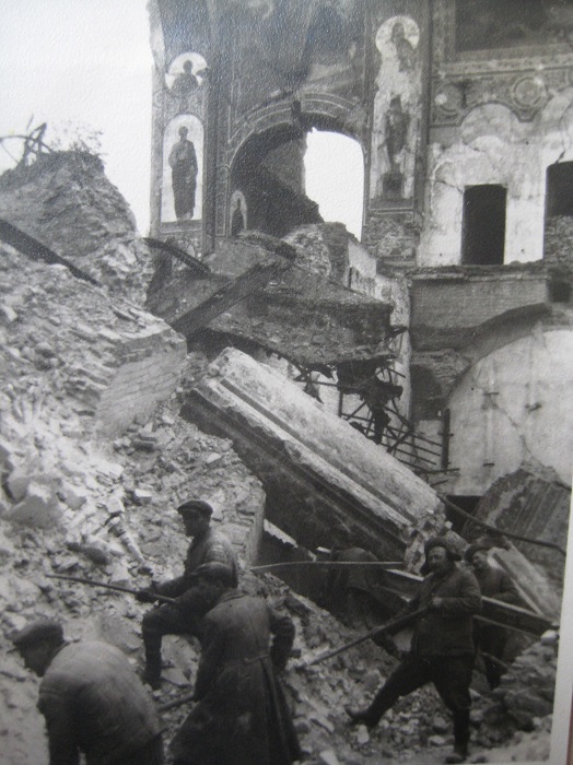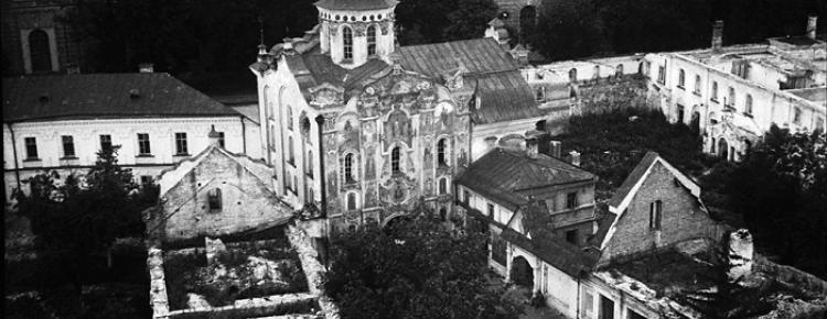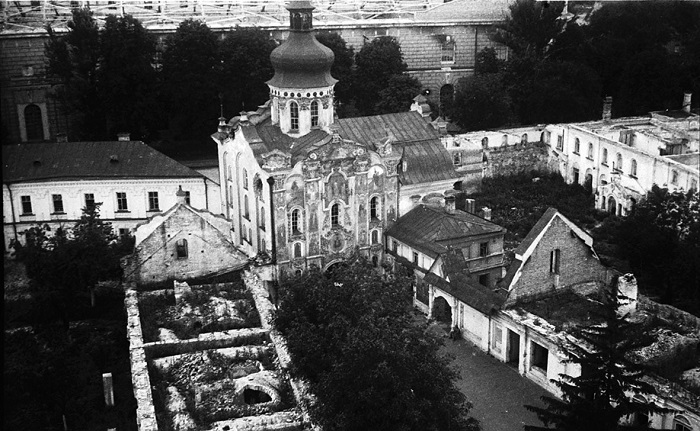 The main work began in 1944. Lavra buildings were inspected. The revealed results were horrible: many buildings were destructed. Damaged or destroyed were thirty two out of thirty five buildings in the Upper territory. In bad condition were also fifteen out of twenty five buildings of the Lower territory. Besides, drainage, water supply and sewerage systems were completely destroyed. Among the architectural monuments most affected by the war were the Dormition Cathedral (that was completely ruined), the Refectory, St. Nicholas and Annunciation Churches (that were 60% damaged), the Onufri Tower (half of which was destroyed), the Great Bell Tower (that lost almost 25% of its constructive elements). At the same time, the war itself or military operations were not the main reason of the destruction of most of Lavra buildings. Only a small part of them were damaged because of that. The core reason of the huge ruination of buildings was the activities of a special team of Nazi occupation troops, which only pretended they were dismantling the ruins. Instead, they systematically destroyed the Upper Lavra sites during autumn 1942 - summer 1943 period. It is thanks to their "efforts" that today we can observe only the walls of many Lavra buildings.