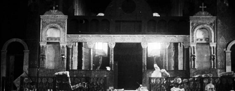 1. Interior of the Church of St. Anthony and Theodosius of Pechersk (Refectory) with shot and broken sculptures