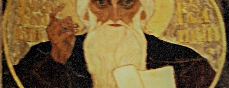 Depicting Saint Ioannicius, Ivan Izhakevych was, probably, guided by “The Life of Our Reverend Father Ioannicius the Great” written by Metropolitan Dimitry of Rostov. The imaginary portrait in the fresco painting of the Refectory Church seems to summarize various impressions that the artist could feel after reading the Life of the Saint. An ascetic champion who lived in the 8th century, in the era of iconoclasm, is depicted as an old gray-haired man, rather strong in complexion: his shoulders are so wide that they barely fit the borders of the medallion. The strength of the figure is emphasized by the black color of the clothes. The Saint’s face is dried by fasting and a long struggle with his own passions caused by devilish temptations, as the Life of the Saint says. A simple ascetic’s chiton can symbolize the monastic clothing, which the Saint wore after taking orders in the monastery. According to the hagiography, Ioannicius had the gift of far-sightedness. Aiming to underline this rare human quality in the picturesque interpretation of the Saint’s image, Ivan Izhakevych depicted Ioannicius with his pointer finger raised. This, as our imagination might suggest, shows that the Saint menacingly warns, as befits a Prophet. The stern look of his huge eyes penetrates into the soul and strikes it through.