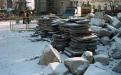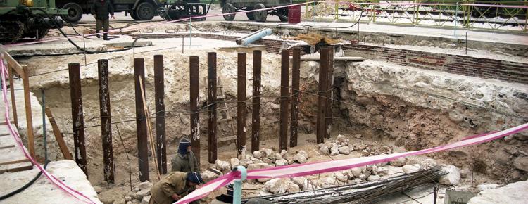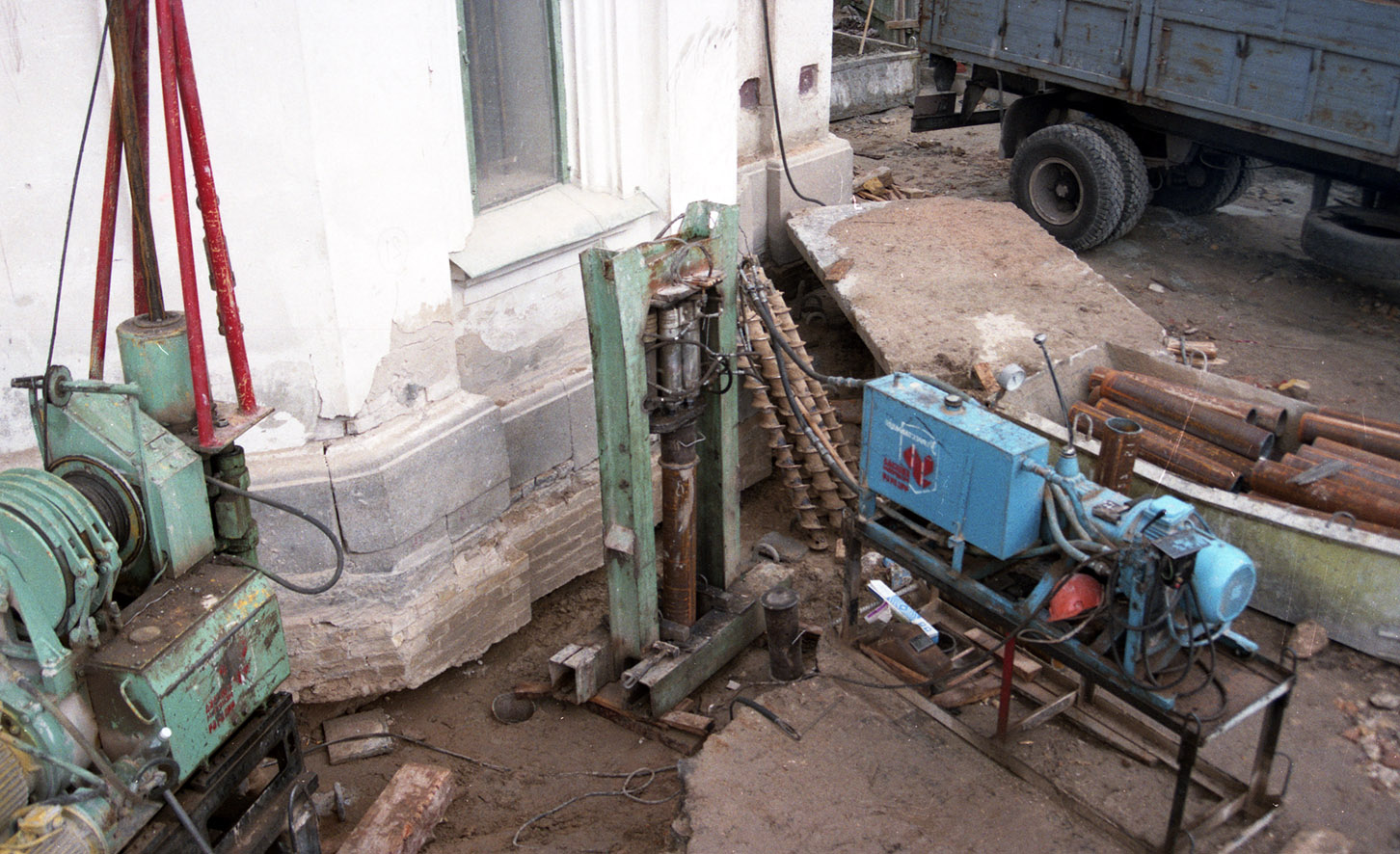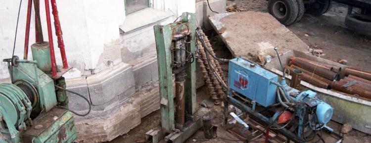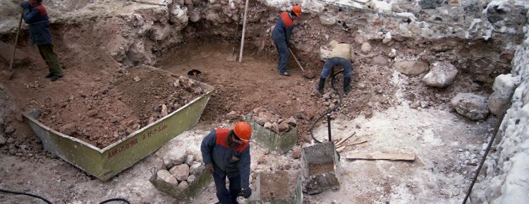 According to the approved restoration project, the ancient masonry was first cleared. At that stage, all the later layers were dismantled. In different years, their purpose was to keep the ruins of the Cathedral from their further destruction. The fragments of the original building materials, which lost their strong connection with the foundation, were also temporarily dismantled (Figs. 2-4). A lot of ruined material was split into individual elements and deformed. In addition, some parts of the Cathedral, built in different periods, were made of diverse building materials. With this in mind, the builders took the decision to reinforce the foundations with Fondedile piles. In December, 1998, they began strengthening the foundation of the Cathedral with Fondedile piles (20 cm in diameter). The piles were pushed to the depth of 22-23 m. Their total number exceeded 700 units (Ills. 5-9).