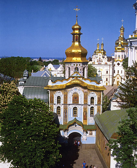 Trinity Gate Church Built in the early 12th century, the Trinity Gate Church was part of the system of ancient defensive constructions of Pechersk Monastery. Today this cultural site is the only monument of the Kyiv-Pechersk Lavra that dates back to the times of Kyivan Rus. The church survived the Mongol invasion of 1240 as well as all further challenges but remained almost undamaged. In the lower tier of the monument, there are the Holy Gates that are the main entrance to the Kyiv-Pechersk Monastery. In its upper tier, there is a small sized church (10×9 m). This church belongs to the type of temples that prevailed in the Kyivan Rus. It is a cross-domed church with four internal piers. There is no choir balcony in the church. At first, it did not have any narthex and the entrance was arranged on the northern side. During the late Middle Ages, the Trinity Gate Church became the main church of the St. Nicholas Hospital Monastery, where an alms-house and a hospital for the monks were functioning. During the Baroque era, the exterior of the church went through significant changes. The narthex was attached to the church in its northern side in the end of the 17th century. In the first half of the 18th century the facades were decorated with stucco ornament, the dome became pear-shaped and gilded. In the 20-30s of the 18th century the interior of the church also changed the walls were repainted in the Ukrainian Baroque style. A three-level wooden iconostasis was installed. In 1900-1902 the facades of the Trinity Gate Church were painted by Lavra artists who worked under the supervision of Volodymyr Sonin. These frescos, being periodically renovated by restorers, decorate the church up to present. In the 1920s, the Trinity Gate Church was used as the center of political education and after the end of the Second World War, in the late 1950s, it opened its doors to the visitors.