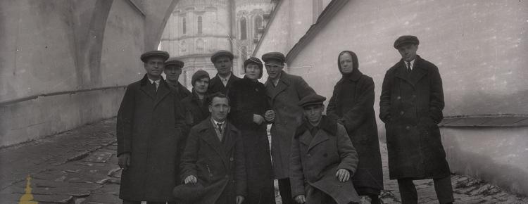 1. Visitors of the All-Ukrainian Museum Town standing on the paved descent under the archbutans of the Printing House of Kyiv-Pechersk Lavra. A fragment of the eastern facade of the Great Pechersk Church is seen in the photo background. Early 1930s (inv. № KPL-N-1463)