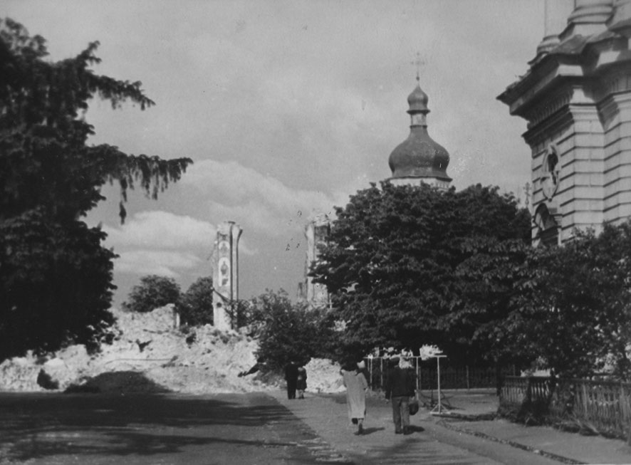 8. Representatives of the parachurch delegation visiting the Church of the Savior at Berestove. The tour is led by Dmytro Krasytsky, the former director of the Preserve (pictured second from the left). The early 1950s