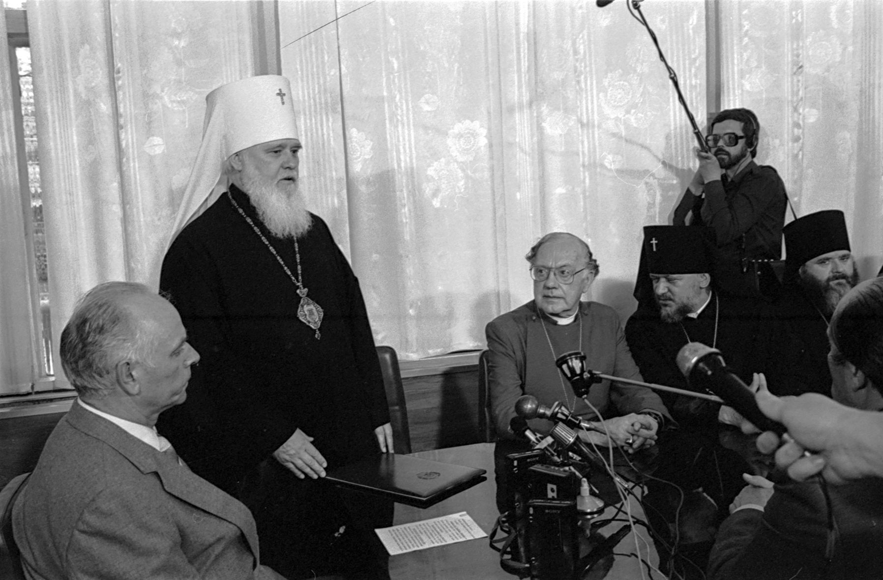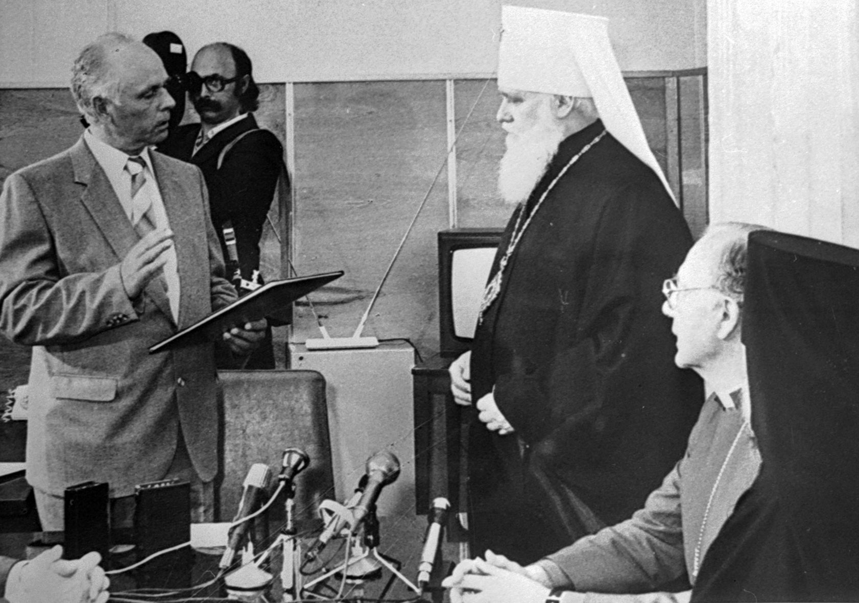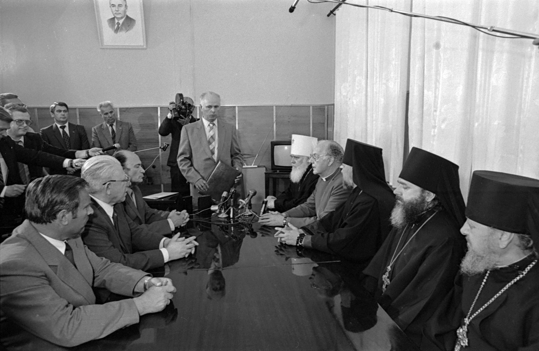 1-3. Delivery of documents on the transfer of the part of the territory of Kyiv-Pechersk Lavra to the Monastery. Standing in the center, in the 1st photo: Mykola Kolesnyk, Chairman of the Council on Religion under the Council of Ministers of the USSR; to his right: Exarch of Ukraine, Metropolitan Filaret of Kyiv and Halych; Robert Rancy, Archbishop of Canterbury, Metropolitan of Canterbury, Primate of All England and spiritual leader of the worldwide Anglican Communion, and representatives of the ROC episcopate. The first on the left: Yu. Kibalnyk director of Kyiv-Pechersk State Historical and Cultural Preserve. June 7, 1988