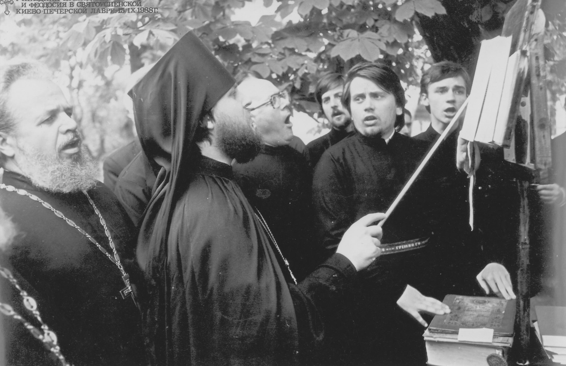 13. The first monastic vows in the revived Kyiv-Pechersk Lavra. In the foreground - Hieromonk Anthony (Novitsky, now Archimandrite). In the background and on the left: hieromonk Stefan (Nescheret, now archbishop of Gomel and Zhlobin); on the right - monk Damian (Davydov, now Archbishop of Fastiv, vicar of the Kyiv diocese). October, 27/28, 1988
