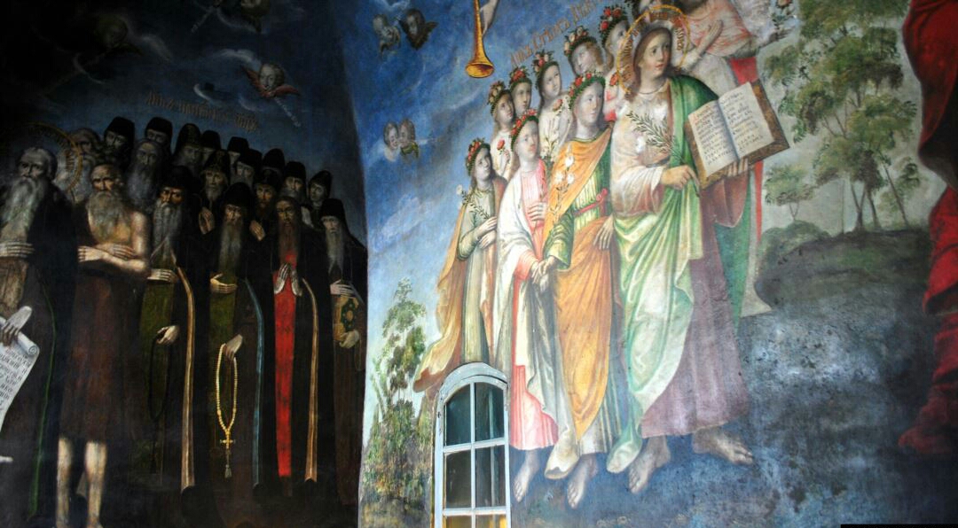 The theological subject of the church begins with the murals of the narthex. All the paintings represent a single complex composition. The image of God the Father in the midst of the Celestial Forces is placed in the main vault (“Shall gather together his elect from the four winds”). The procession of several multi-image groups of saints against the landscape is depicted on the walls. Together they represent Heavenly Triumphal Church.