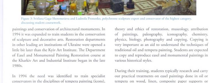 Статья подробно освещает внедрение первых реставрационных отделений в художественных учебных заведениях Киева, Харькова и Львова. Рассказывается, как на созданных кафедрах реставрации произведений искусства преподают будущим реставраторам специальные дисциплины, в частности историю, теорию и этику реставрации, музейное дело, палеографию, иконографию, химию, физику, биологию и пр. Преподаватели этих вузов обучают студентов научному подходу к реставрации, осторожности и ответственности, ради точного сохранения подлинности каждого памятника искусства.