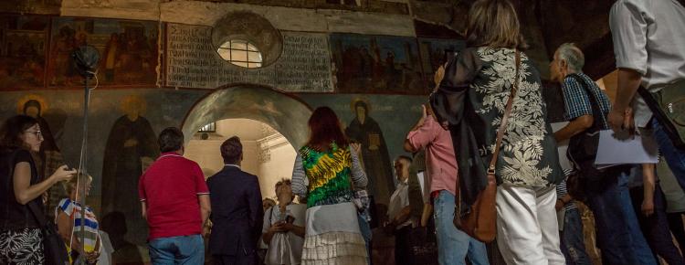 Після завершення презентації проекту, представників ЗМІ запросили оглянути інтер’єр церкви. Начальник науково-дослідного відділу вивчення мистецької спадщини Національного Києво-Печерського історико-культурного заповідника, кандидат мистецтвознавства Аліна Кондратюк звернула увагу присутніх на унікальні фрески ХІ-ХІІ століття «Явлення Христа учням на Тиверіадському морі» та «Моління». Також вона продемонструвала написи (графіті) на стінах храму, процес дослідження яких триває дотепер.