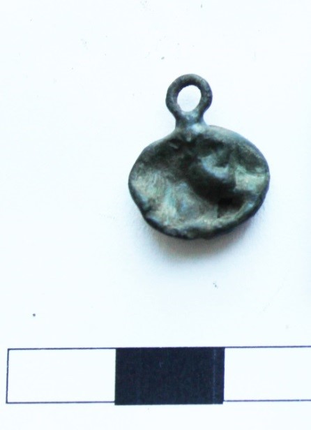 - кулеподібний бубонець-ґудзик із кольорового металу (мідь?) з лінійною проріззю;