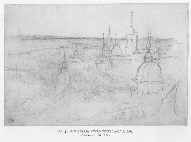 Тарас Шевченко був у захопленні від величі архітектурних споруд, краєвидів Києво-Печерської лаври – найбільшої і найвизначнішої серед православних святинь України. Збереглося три малюнка Тараса Шевченка олівцем 1843 року – “Дальні печери Києво-Печерської лаври”, “Київ з-за Дніпра”, незавершений малюнок «Київ з боку Дніпра” і сепія “Церква Всіх святих у Києво-Печерській лаврі” (1846). Не знайденими залишилися твори художника: “Печери Київської лаври”, “Лаврська церква з дзвіницею” (кілька варіантів), “Старці”, “Портрет отамана старців”, на яких зображено Лавру.
