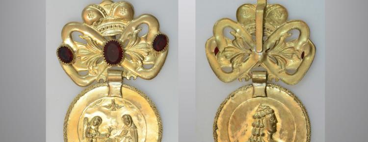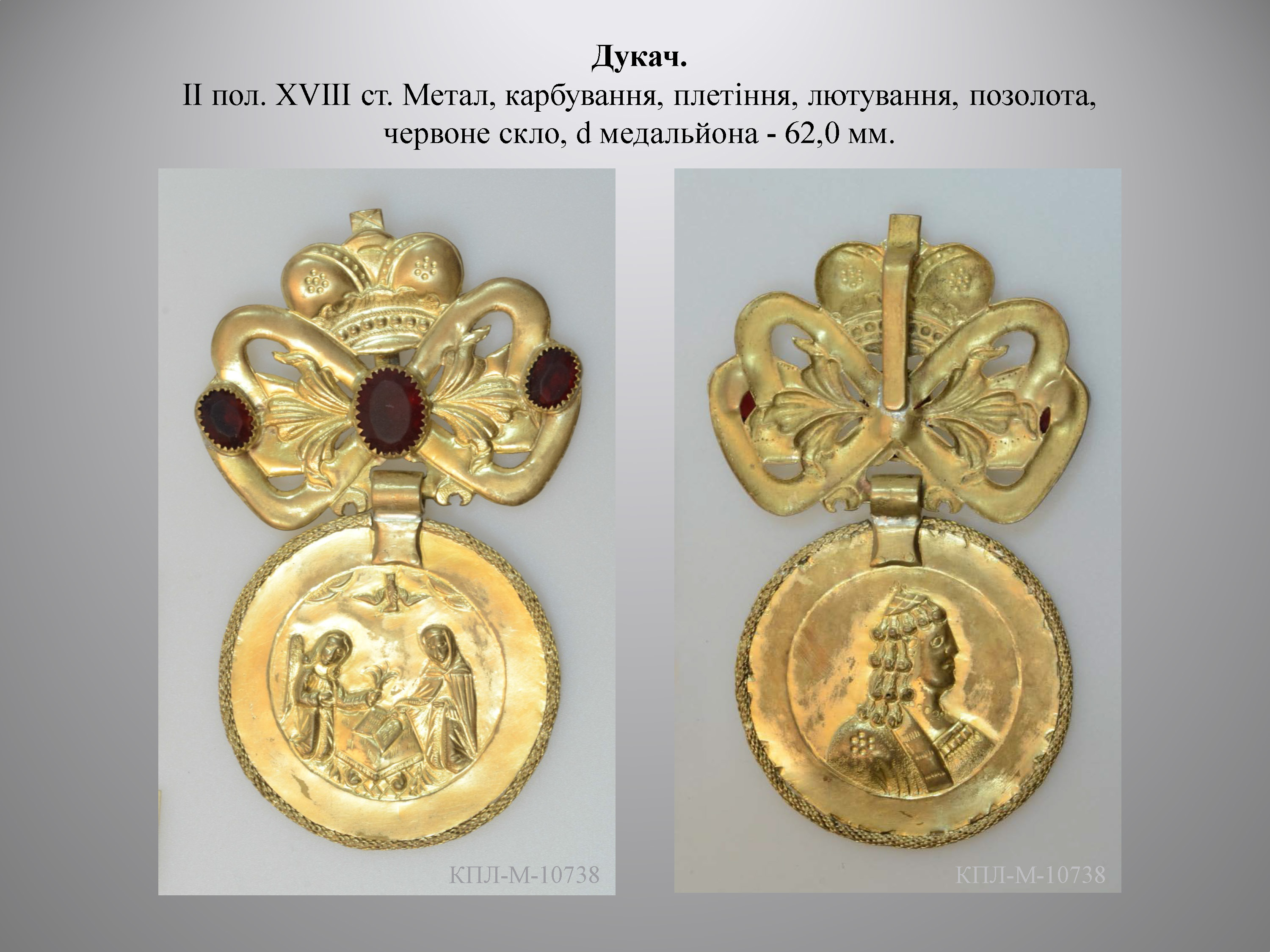 - Дукач. Друга половина ХVІІІ ст. Некоштовний метал, карбування, плетіння, лютування, позолота, червоне скло, d медальйона 62,0 мм. На аверсі зображено сцену «Благовіщення», на реверсі – жіночий профіль. КПЛ-М-10738.