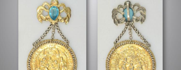 - Дукач. Друга половина ХVІІІ ст. Срібло, карбування, плетіння, лютування, позолота, блакитне скло, d медальйона 54,0 мм. На аверсі зображено сцену «Обрізання Христа», на реверсі – «Хрещення» (відтворення західноєвропейської хрестильної медалі). КПЛ-М-5158.