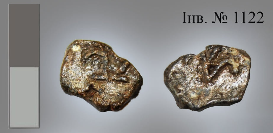 Пломба 1 (інв. № 1122), розмір 1,1×0,8 см. Емблема на лицевому боці – зображення княжого знаку прямокутних обрисів у формі подвоєного двозубця (?) або ж двозубець прямокутних обрисів. На зворотному боці – слов’янська літера «Ѧ» (юс малий). Емблема, скоріше за все, літера, аналогії князівському знаку тут умовні. Близький за формою знак зафіксований на пломбі з Дорогичина Набузького. Літера «Ѧ» так само часто зустрічається на пломбах західних кордонів Галицької і Волинської земель, наприклад, у Чермно.
