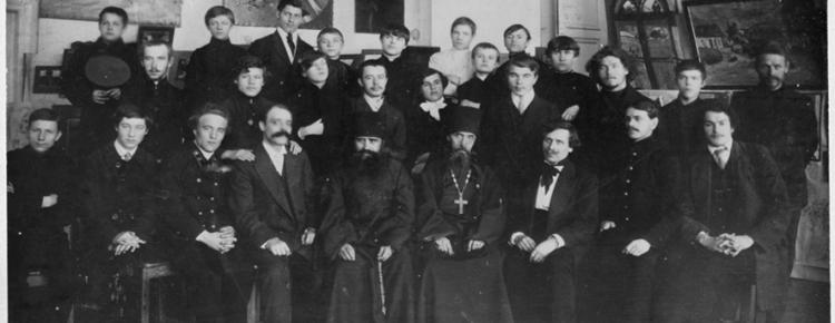 7. Викладачі та учні лаврської іконописної школи. В центрі – начальник іконописної майстерні Володимир (Соколов) та І. С. Їжакевич. 1905–1906 рр.