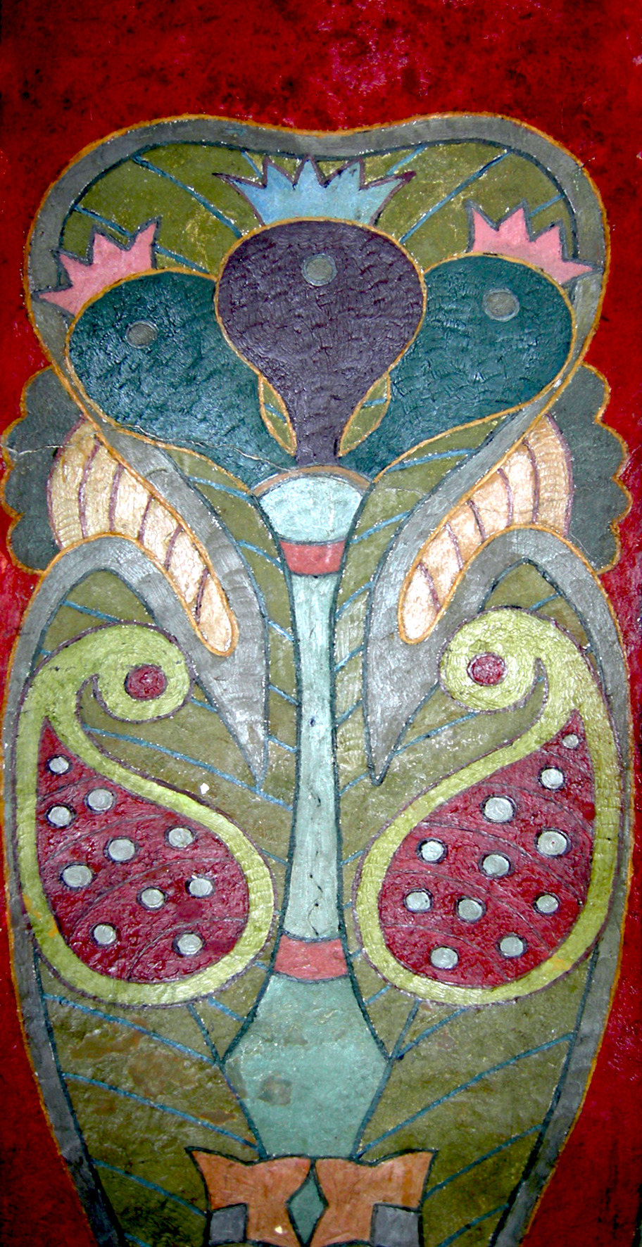 Межу притвору й паперті Всіхсвятської церкви позначено аркою. Орнаментальне, барвисте зображення чудо-рослини, що прикрашає арочні пілони, можна вважати орнітоморфним, оскільки структурні й кольорові хитросплетення дерева-квітки викликають у глядача виразні асоціації з птахами. Але бутони, які простягаються до світла, тільки схожі на маленьких істот, які розкрили свої дзьобики, – вони лише віддалено нагадують пташенят. Два яскраво-червоні, наповнені насінням плоди, які дозріли на міцному стеблі дерева, глядацька уява вподібнює птахам-батькам із розкішними гребінцями і потужними дзьобами. Тому, розглядаючи орнамент уважніше, розумієш, що враження, спровоковані лінійно-кольоровою арабескою цієї композиції, є почасти плодом фантазії: перед нами все-таки – зображення рослини.