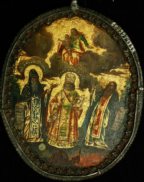 Іл. 4. Ікона овальна, двобічна з вибраними святими: Микола Чудотворець з Антонієм і Феодосієм Печерськими. XVIII ст. Київ. (КПЛ-Ж-135).