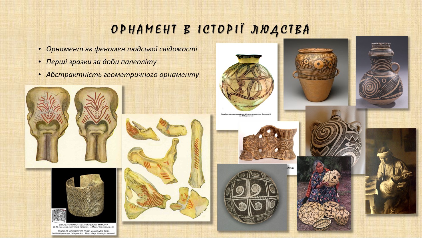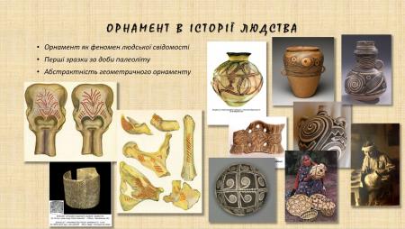 Орнамент є одним з найдавніших проявів людської свідомості, його глибоке коріння в історії людства підтверджено археологічними джерелами. Природа цього феномену зумовлена усвідомленням циклічності процесів у Всесвіті, необхідністю оцінки та прогнозування ритмів «світового порядку». Така потреба визначає ключові характеристики орнаменту – ритмічність та симетрію, завдяки яким він вирізняється серед інших різновидів зображень.