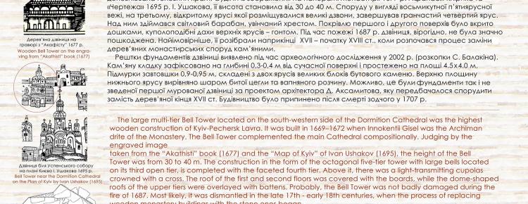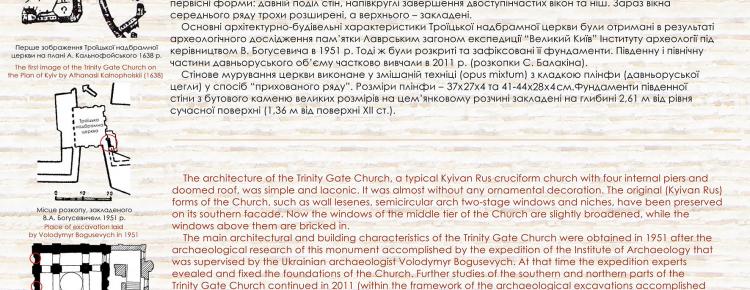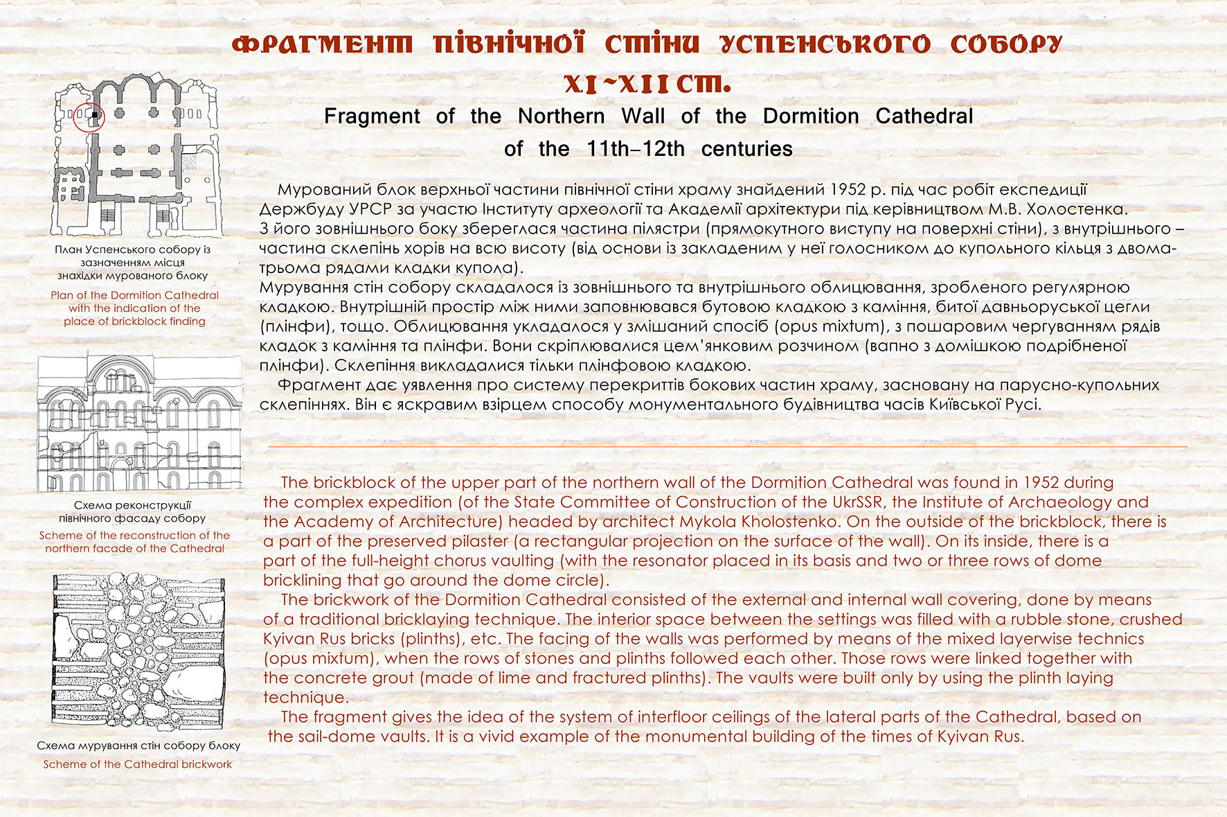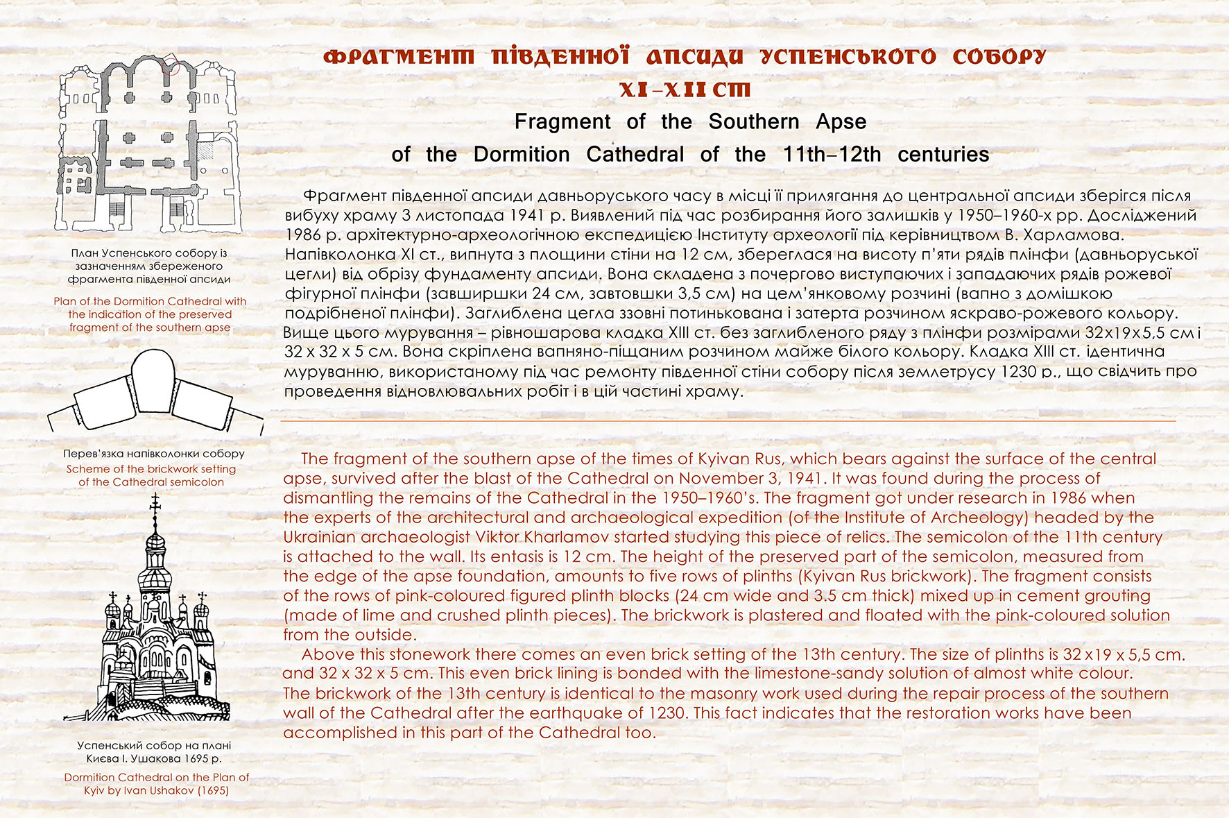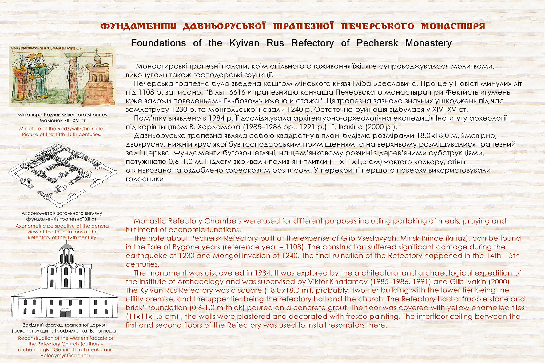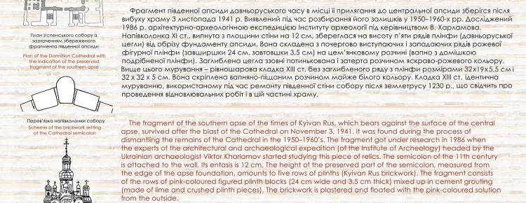 Протягом 2018–2019 рр. було реалізовано перший етап проєкту з маркування історичного простору нашого заповідника, в т.ч. – основних об’єктів архітектурно-археологічної спадщини (іл. 1). У його межах колектив науково-дослідного сектора археології розробив макети для шести археологічних туристично-інформаційних стендів (іл. 2-7). Характерною заливкою тла робочої площини для археологічних стендів стало контурне зображення будівельної кладки давньоруської цегли – плінфи. Найважливішим компонентом стенда є чітка та лаконічна двомовна текстова частина, яка подає основну інформацію щодо суті пам’ятки, персоналій та часу її дослідження, пояснює історичне значення та акцентує її значущість для сьогодення. Текст підготовлено з урахуванням основних засад музеології – упізнаваність, читабельність, зрозумілість. Між українською та англійською частинами для кращого зорового сприйняття розміщено розмежувальну лінію. Не менш важливими є ілюстрації, що доповнюють та пояснюють текстову частину. Якщо археологічний об’єкт не зберігся (частково або повністю), його візуалізації допомагає наведення сучасної реконструкції або відомих зображень із писемних джерел.