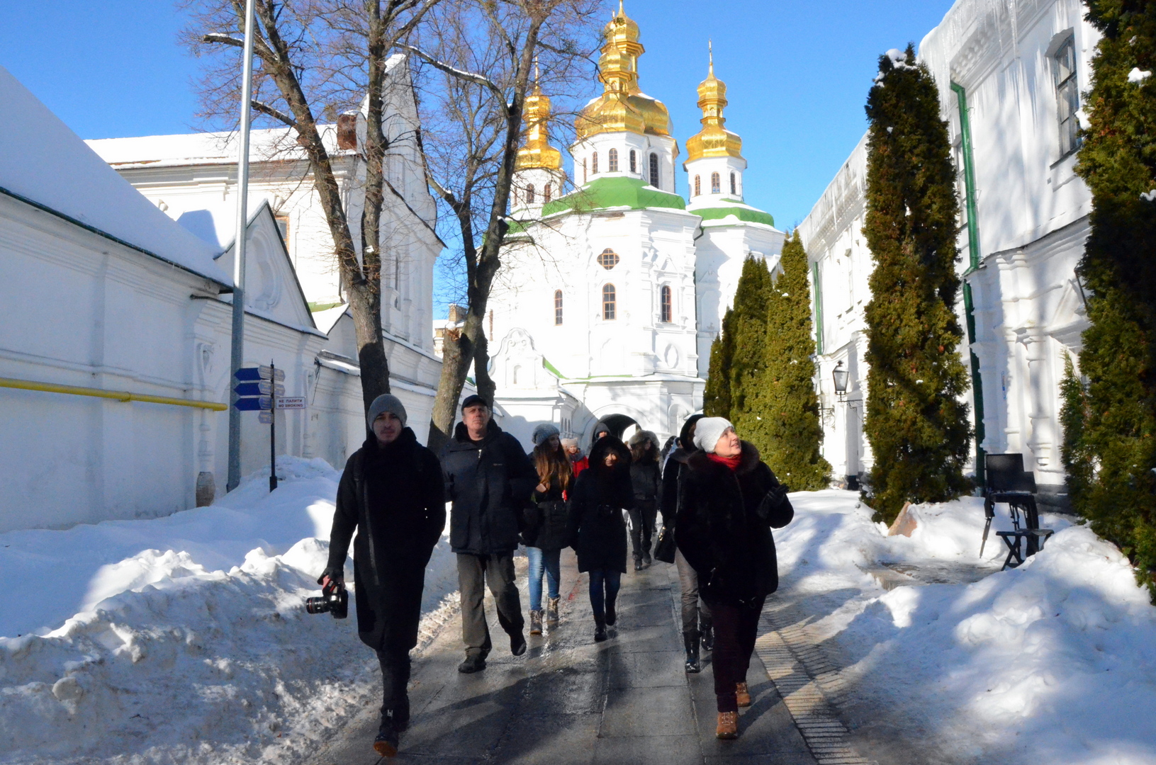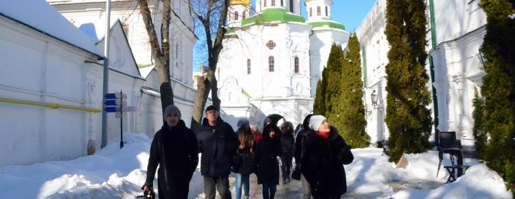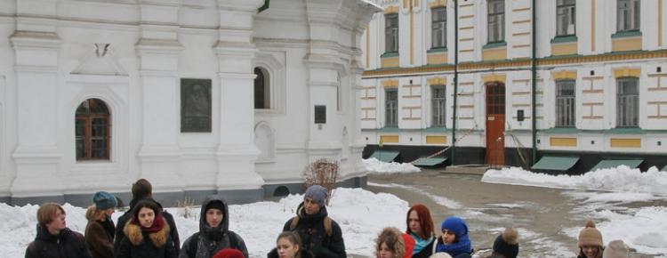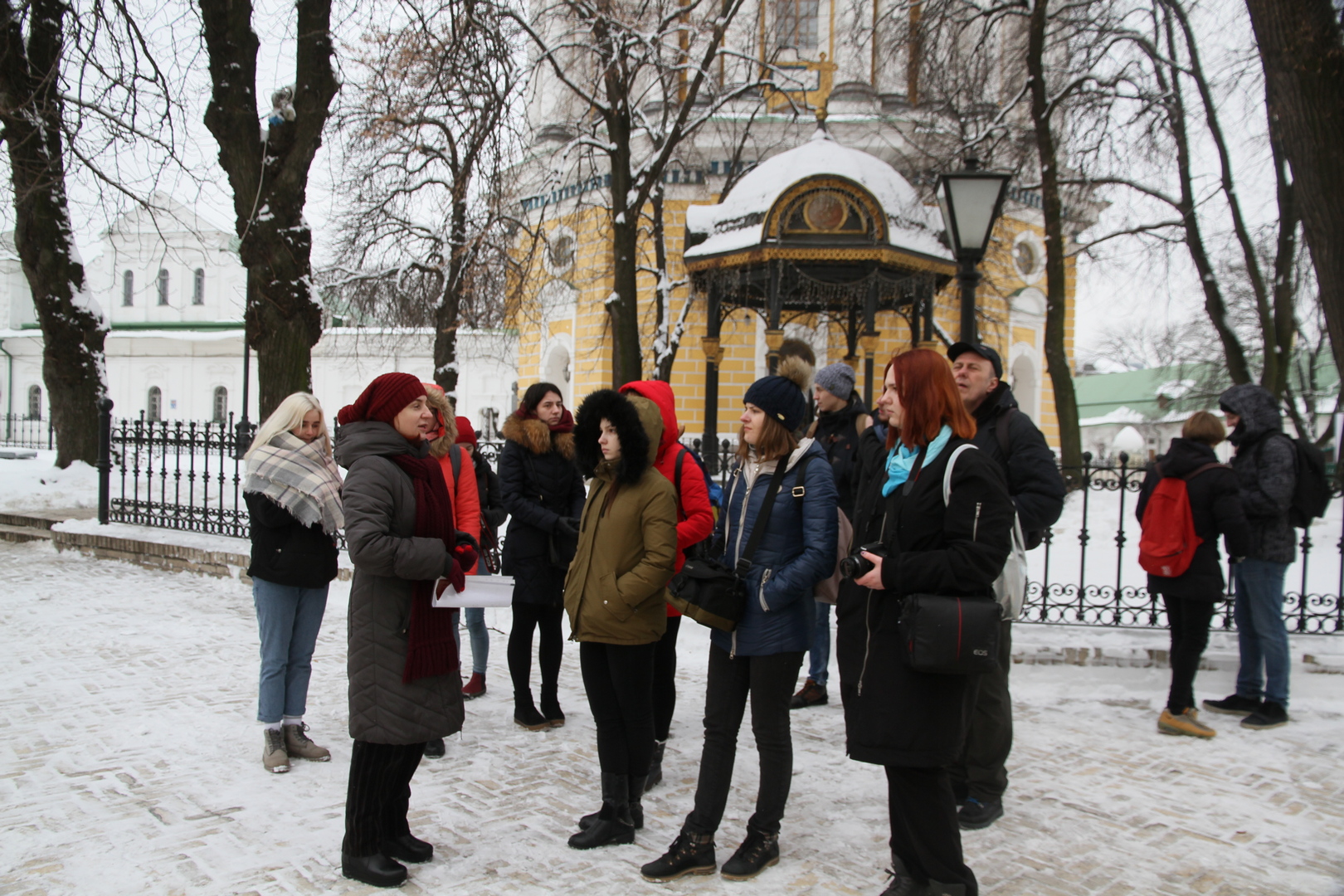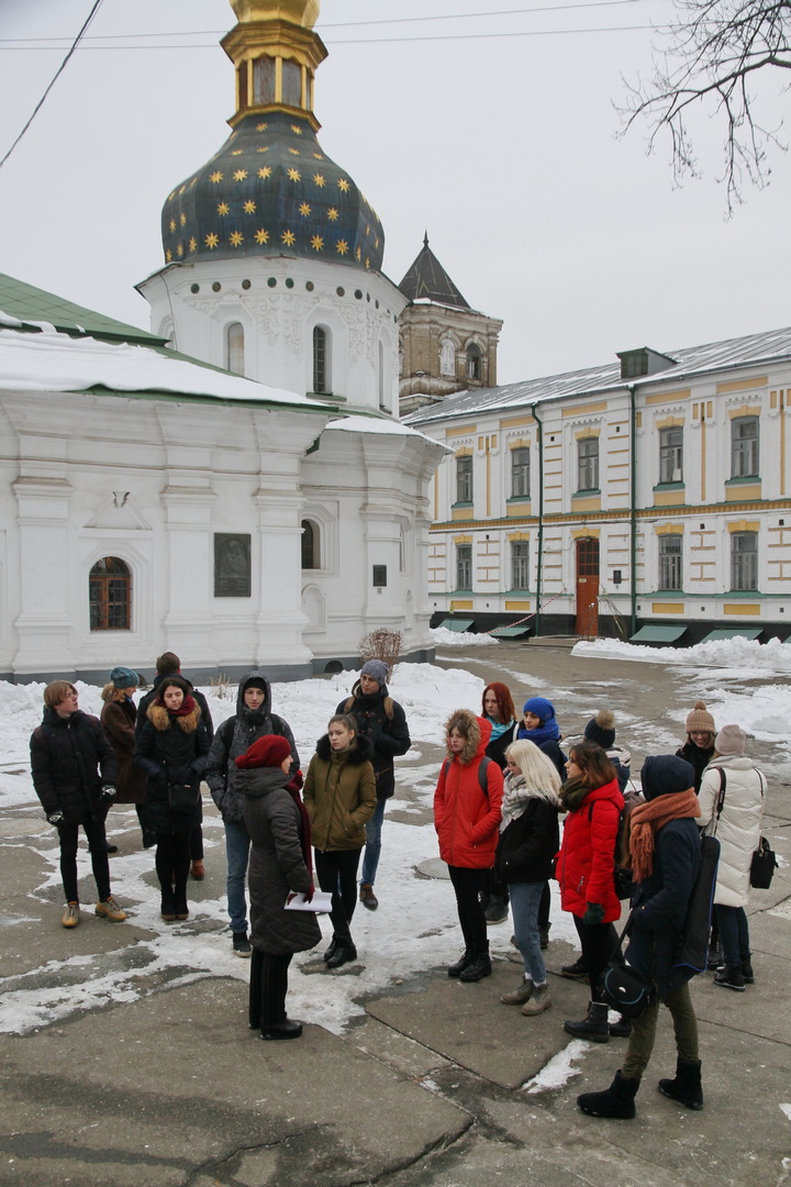 2. старший науковий співробітник науково-дослідного відділу вивчення мистецької спадщини Пітатєлева О.В. зі студентами Київського Національного університету технологій та дизайну на Економічній вулиці Києво-Печерської лаври. Фото 2017 р.