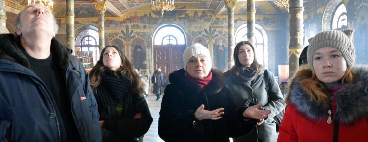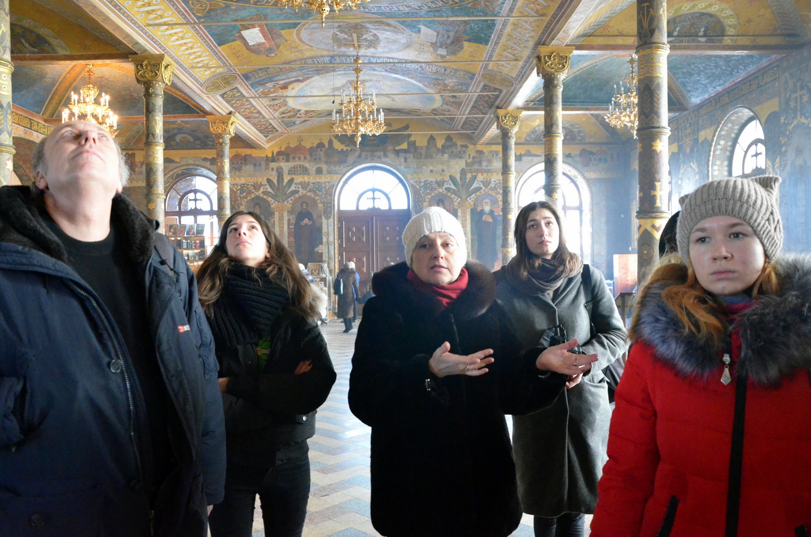 3. старший науковий співробітник науково-дослідного відділу вивчення мистецької спадщини Пітатєлева О.В. зі студентами Київського Національного університету технологій та дизайну в інтер’єрі Трапезної палати Києво-Печерської лаври. Фото 2017 р.