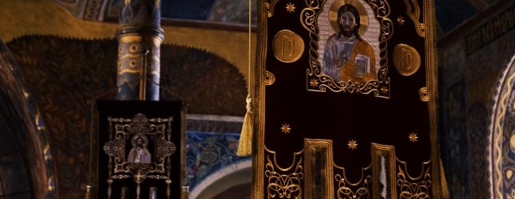 10. В інтер’єрі Трапезної палати при церкві Прпп. Антонія і Феодосія Печерських. Хорогви. Фото О. Угарової, 2018 р.
