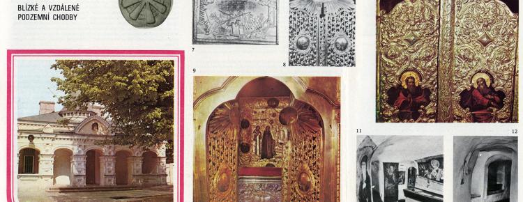 У випуску, що оповідав про буклети 1960-х рр. ми докладно зупинялись на визначенні буклета як окремого виду поліграфічної продукції та звертали увагу на те, що за якістю зображень він зазвичай поступається листівкам (див.: випуск №41). Втім, у буклетів є й своя перевага – вони можуть бути набагато інформативнішими за листівки й слугувати певним міні-путівниками пам’ятками Заповідника. У 1970-ті рр. як і раніше, найчастіше друкували буклети, які в кількох реченнях оповідали про Заповідник і його історію та містили план-схему з розгорнутою (або не дуже) легендою. Та водночас з буклетами «загального змісту» почали з’являтись й ті, що було присвячено окремим пам’яткам лаврської архітектури. Цьому сприяло й підвищення якості поліграфії, адже тепер, крім загальних зображень пам’яток, в буклетах можна було відтворювати окремі архітектурні деталі або фрагменти живопису. У 1974 р. у київському видавництві «Реклама» накладом 50 тис. примірників кожний надрукували цілу серію з 8-ми окремих буклетів. Два з них оповідали про Києво-Печерський державний історико-культурний заповідник українською (менший розмір, коротка інформація) та російською (вдвічі більший розмір, розширена інформація), а також п’яти найцікавішим пам’яткам – Успенському собору, Великій лаврській дзвіниці, Троїцькій надбрамній, Спаса на Берестові й Всіхсвятській церквам. Останній, восьмий буклет – із зображенням церкви Прпп. Антонія і Феодосія з трапезною палатою було присвячено виставці «Християнство та атеїзм на Україні». На відміну від інших, суто інформаційних буклетів, він мав відверто пропагандистський характер. Про саму пам’ятку йшлося лише в невеликому першому абзаці, далі розповідалося про «боротьбу передових діячів науки і культури проти релігії так церкви». Закінчувався текст цитатою з доповіді Л. І. Брежнєва на XXIV з’їзді КПРС. На жаль, жодного зображення самої експозиції в буклеті не було: текст проілюстровано лише картиною Ю. Баланівського «На монастирському полі» (1970) із зображенням конфлікту ченця з селянами на фоні далеких абрисів Лаври.