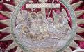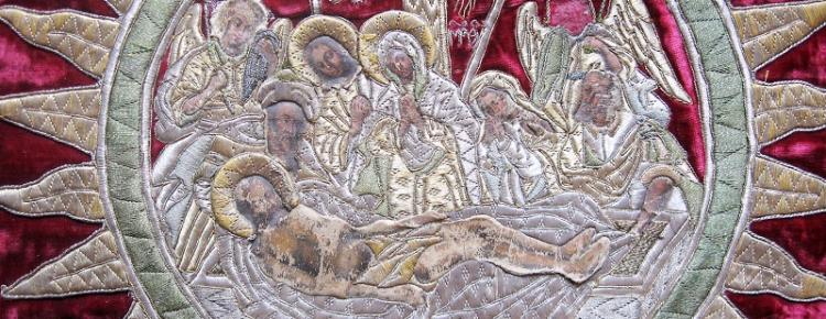 Іл. 1. «Покладення Христа до гробу». Фрагмент гаптованої композиції на воздуху 1746 р. (КПЛ-Т-1005). Гаптування золотними, срібними і сканими нитками технікою «за картою».