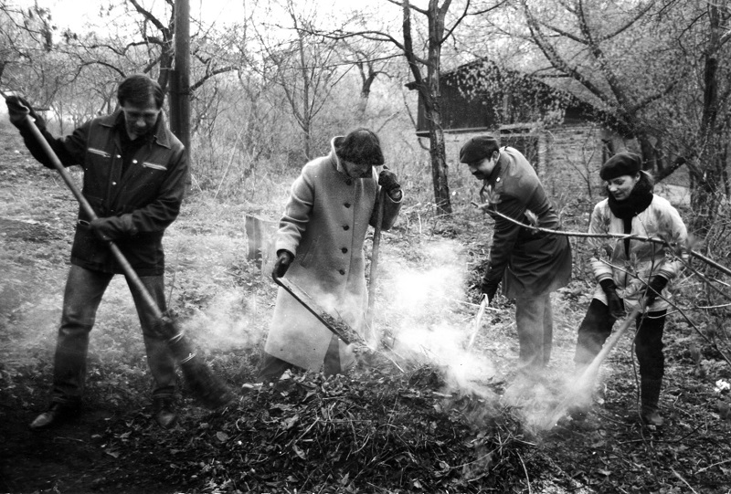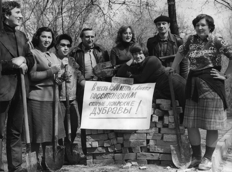 2. Прибирання в саду Ближніх печер. Науковці А. Коляда, Т. Хорольська, Ю. Скороход, Л. Гупаленко. Середина 1980-х рр.