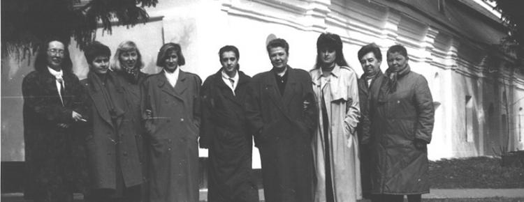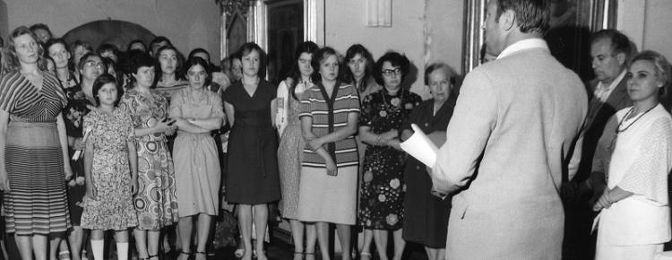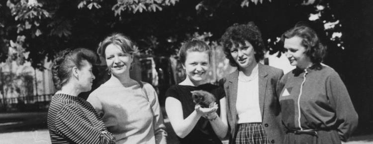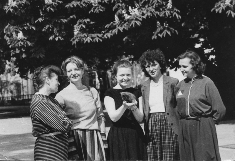 6. В очікуванні екскурсантів. Зліва направо: Г. Литвиненко, О. Лопухіна, Т. Малишенко, Н. Свешнікова, Н. Лупанова. Середина 1980-х рр.